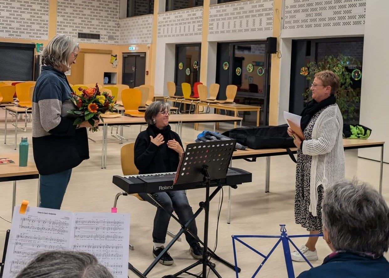 Vor 20 Jahren - im Herbst 2004 - hatte Veronika Rüfer die Leitung des Türkenfelder Chors übernommen. Mit einem Überraschungsfest würdigten die Sängerinnen und Sänger nun die Arbeit ihrer engagierten Chorleiterin. In einem Jubiläumsalbum und einem Gedicht ließen die Voices die zurückliegenden 20 Jahre in Schlaglichtern Revue passieren. „Ich habe wirklich nix geahnt“, so Veronika später. Danke für deine erfolgreiche Arbeit in den vergangenen 20 Jahren – und auf hoffentlich noch viele weitere gemeinsame Chorstunden!